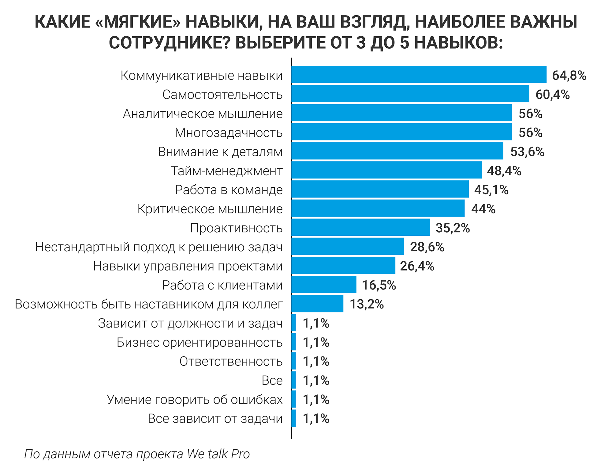 В топ-5 «мягких» навыков входят коммуникативные, самостоятельность, многозадачность, аналитическое мышление и внимание к деталям.
