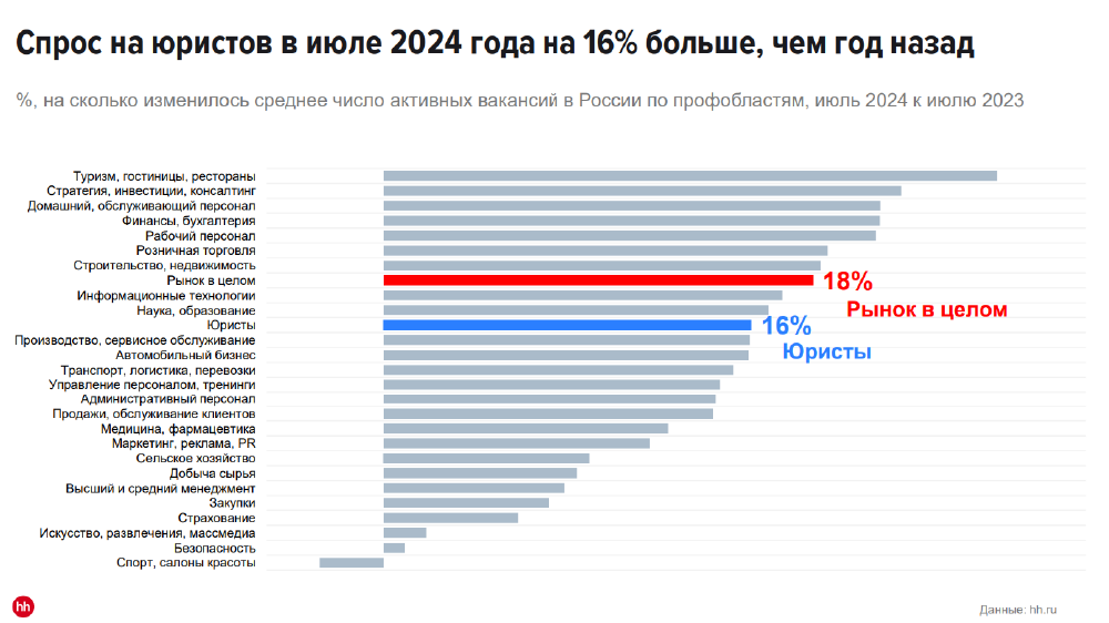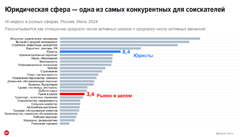 Исследование, подготовленное аналитиками HeadHunter (есть в распоряжении редакции), демонстрирует, что в последний год более чем на 15% вырос спрос на юристов. За тот же период с 12 до 8 кандидатов уменьшился конкурс на одну юрвакансию. Несмотря на такое снижение, правовая сфера остается одной из самых конкурентных для соискателей, подчеркнул Юрий Донников, директор юридического департамента и комплаенс HH.