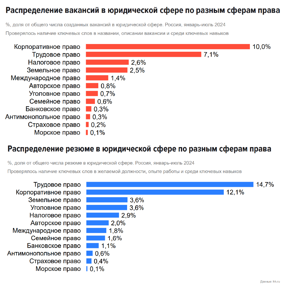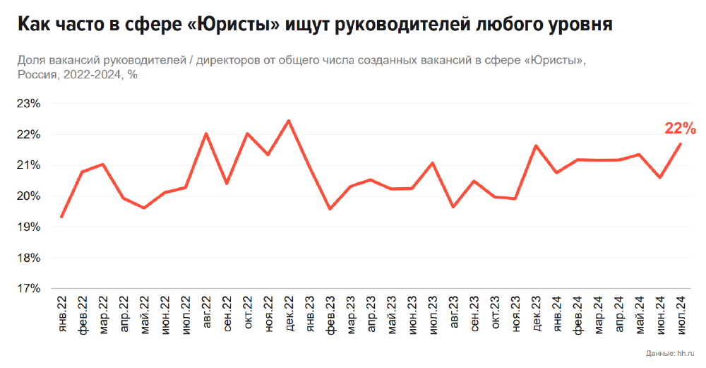 Еще один тренд — более 95% новых вакансий и резюме в юридической сфере касаются должностей рядовых юристов. При этом нельзя не отметить заметный рост спроса на руководителей разного уровня в юридической сфере, включая head of legal (директоров юридических департаментов), говорит Донников. Рост числа таких вакансий в июле 2024-го к январю 2022-го составил 22%, что довольно много для сферы управленцев разного уровня в юридическом мире. На эту динамику роста вакансий среди управленческого уровня стоит обратить внимание тем, кто планирует обучаться и развиваться, чтобы стать руководителем юридической функции, подчеркивает эксперт.