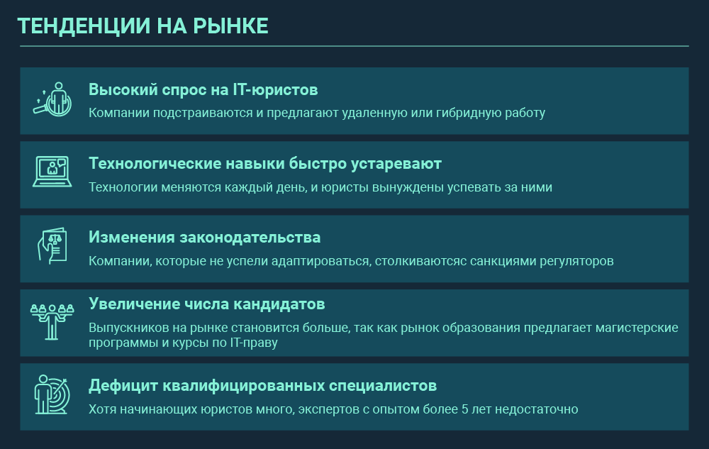 Он советует юристам сфокусироваться на экспертизе в IT и международном праве, чтобы выйти на новый уровень. Правда, начинающим специалистам не всегда просто разобраться, как же им следует углублять знания. Проблема состоит в том, что не во всех вузах до сих пор учат интеллектуальному, информационному праву, защите персональных данных, обращает внимание Роман Янковский, академический директор Moscow Digital School. Соответственно, студентов выпускают без базовых знаний в этих предметах, а без них даже собеседование не пройти.