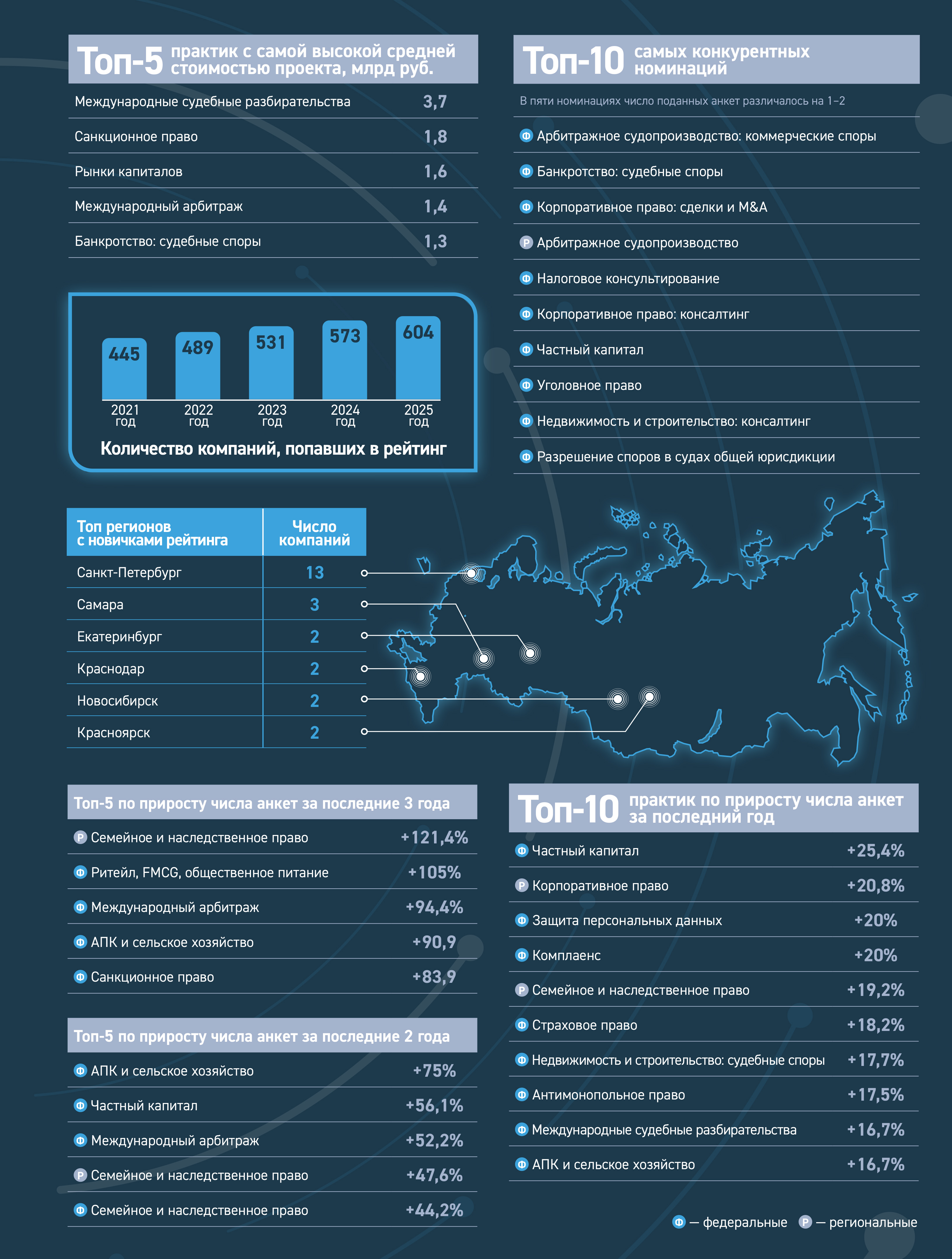 В 2025 году рейтинг «Право-300» снова показывает, насколько быстро меняется рынок. В исследовании появилась новая номинация «Производство и промышленность», а участники стали активнее конкурировать за внимание клиентов и экспертов. Всего в этом году подали 2681 анкету — это ненамного больше прошлогоднего результата, но каждая заявка стала содержательнее: компании сосредоточились на сильных проектах с очевидной ценностью для клиента. Количество проектов выросло на 4,99% — до 25 397, а их общая стоимость на 29% — до 662 трлн руб. Самой высокой средней стоимостью проекта отметилась практика «Международные судебные разбирательства».